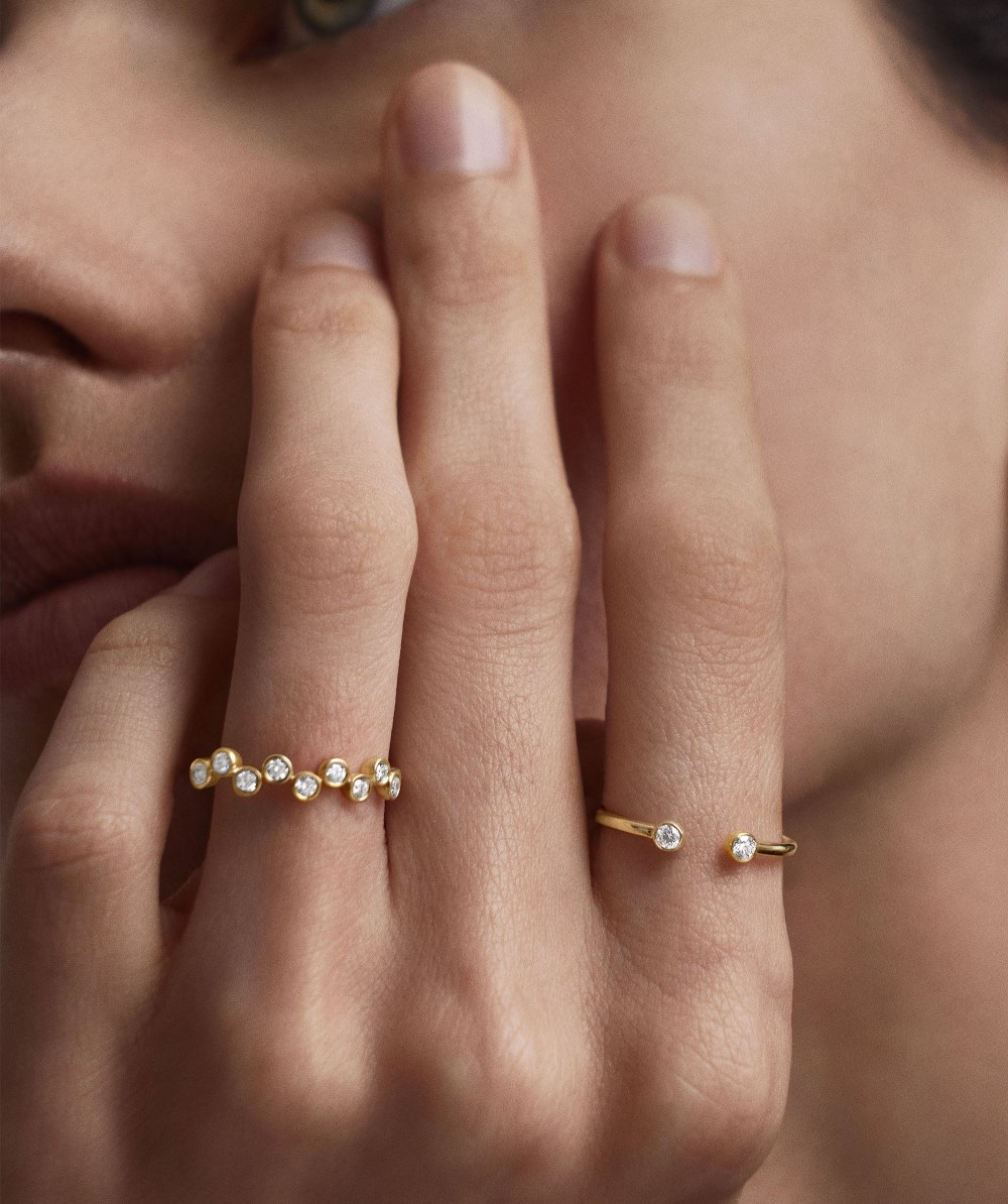 Two is better than one. With a bezel setting these 0.03 carat Kimberly Process diamonds dance. The open design makes this ring stand out even when stacked with friends, like the Stacker, Twist or Beaded Rings.When properly cared for, our 14k gold pieces can last forever. With its beautiful, subtle hue, you can wear your jewelry every day, everywhere.