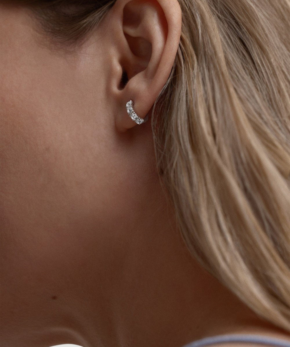 Dainty size, big impact. Lab grown round white sapphires perfect for everyday shine, in the most wearable 12mm hoop.Our lab grown gemstones share the same physical and chemical properties as natural gemstones. They are valued for their beauty and longevity.