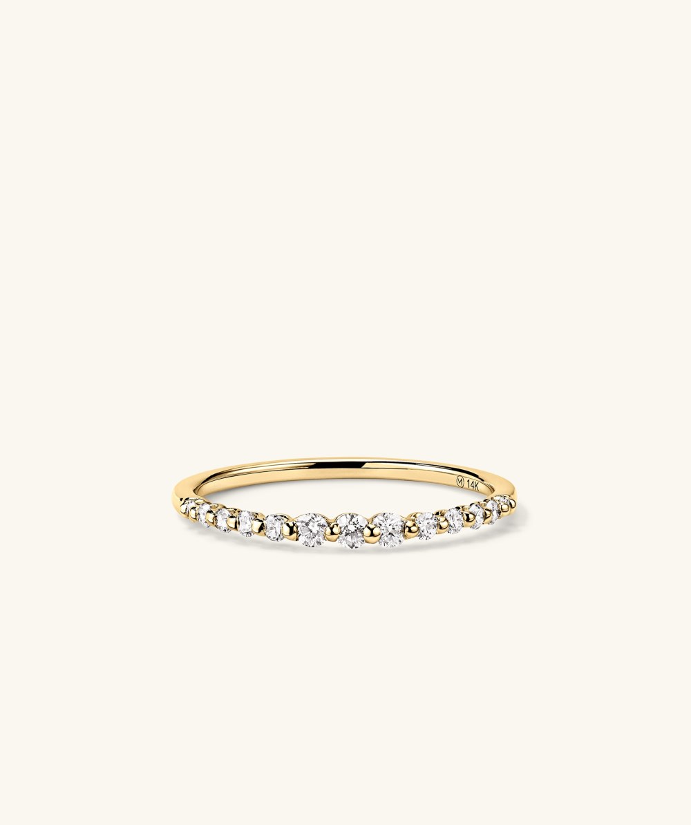 Intricate details keep things interesting—and this ring has it all figured out. Handcrafted in 14k gold featuring a single shared prong setting that gives a floating diamond effect. Plus, the graduating size of natural diamonds around the band adds impact and dimension.When properly cared for, our 14k gold pieces can last forever. With its beautiful, subtle hue, you can wear your jewelry every day, everywhere.